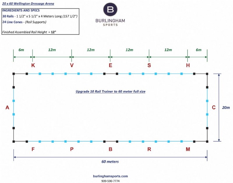 Our “short” length rail is 1.5″ thick and 5.5″ high (same as standard). Their length is 112.5 inches (2.858 meters) or 9.45 feet. The short rail option makes this setup truly a mobile dressage arena. You can find those options for portable dressage arenas.