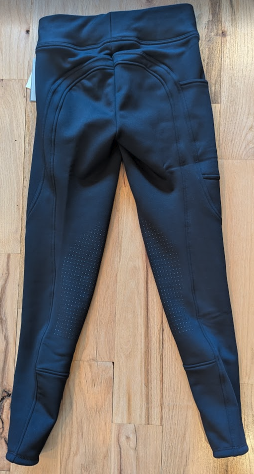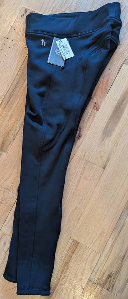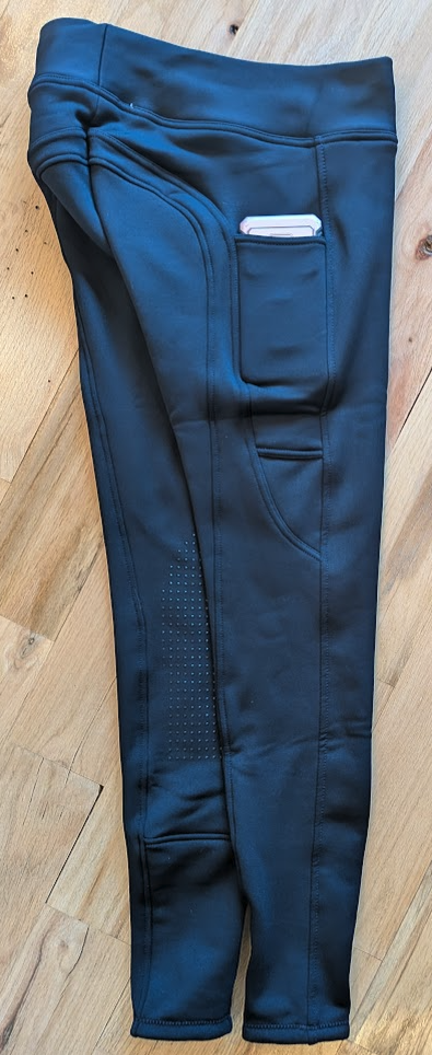 Winter riding tights with warm lining are a cozy alternative to formal breeches all winter long. The mid rise waist is comfortable enough by itself or with layers, the materials won’t bind. Breathable fabric that’s super soft and durable for many cold weather rides. Knee patch silicone pads give enough grip to continue your caveletti routines in the winter. They feel like sweatpants but look like show quality breeches!